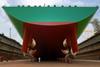 AkzoNobel's Intersleek hull coating. Underside view of a ship in a dry dock after application of new hull coating.