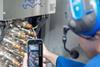 An Alfa Laval engineer working on some equipment and looking at a smart phone screen